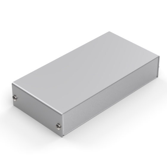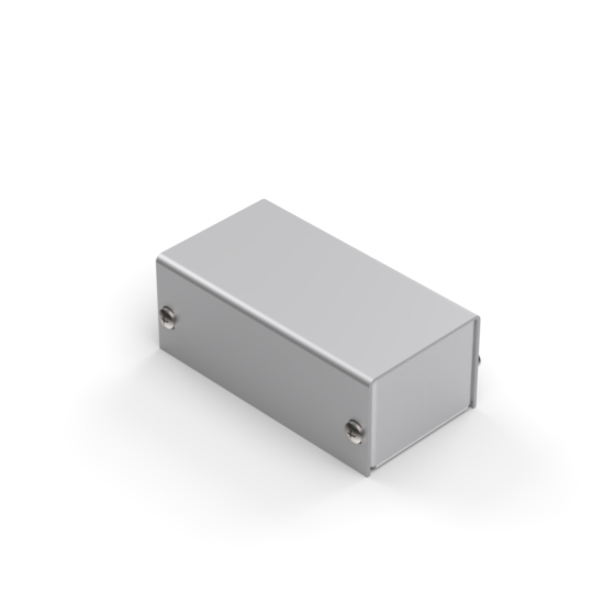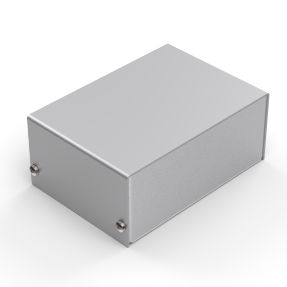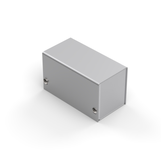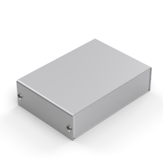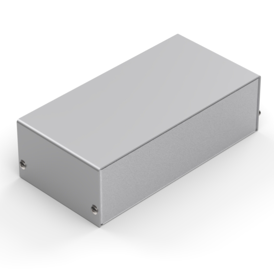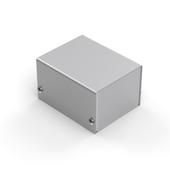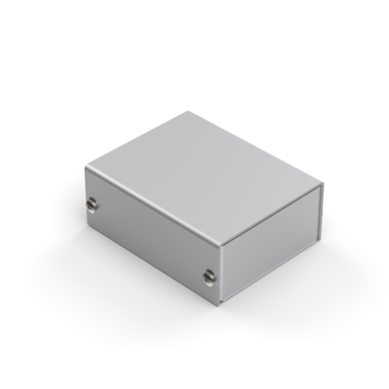 Aluminium enclosures with silver metalised base and cover. Simple and speedy to assemble, with four screws to put in place.