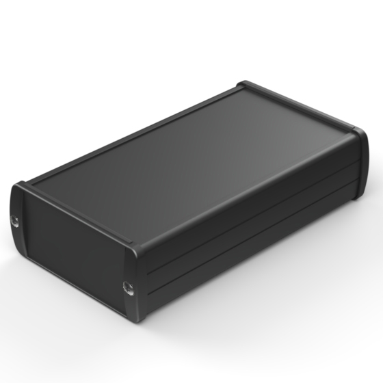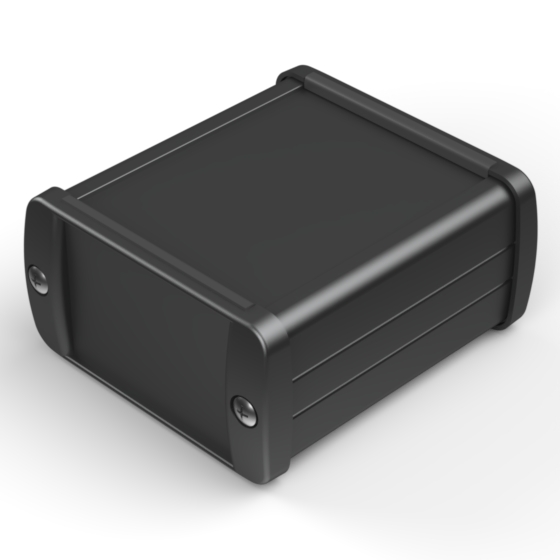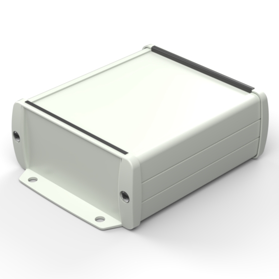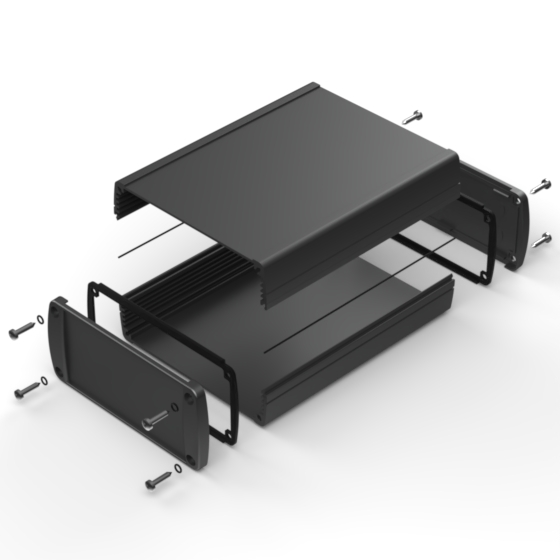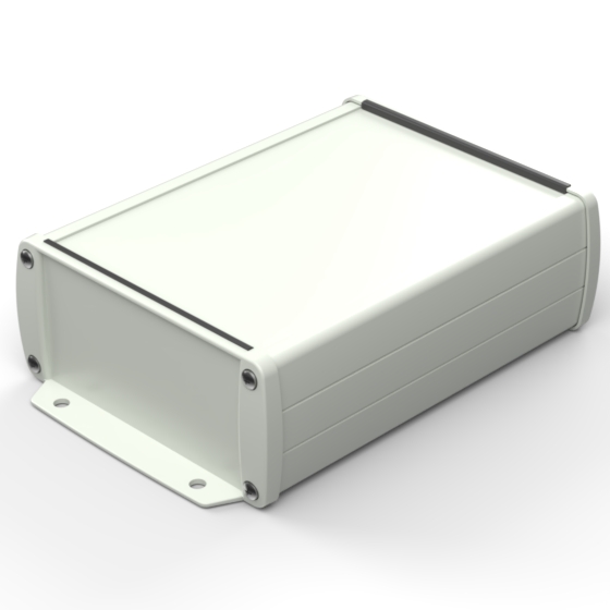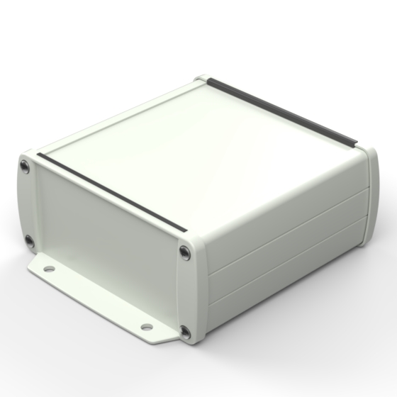 Extruded aluminium case with powder coating and two rubber sealing kits to protect against water and from dust (IP65) available in six different colours. Two metal front panels, internal slots for PCB’s and a recessed area for a keypad membrane. The models with “E” have mounting wall metal panels. Closing by four or eight screws.