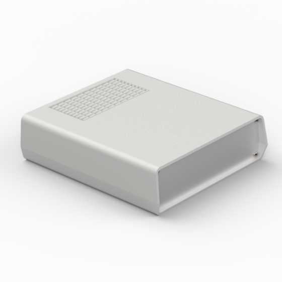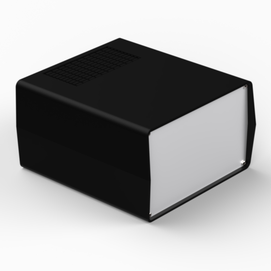 ABS enclosures with a vented cover and base for aeration. Front and rear 1 mm aluminium panels. Each half-shell has integral PCB guides and mounting studs. Matt surface finish. Closing by eight screws.