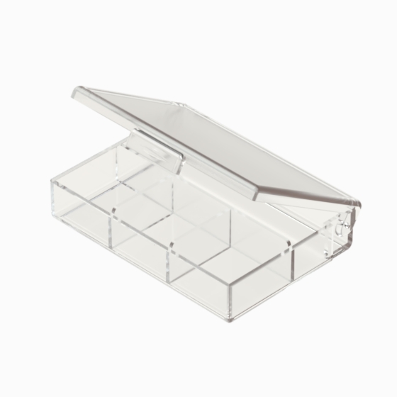 Series of small storage boxes with hinged transparent polystyrene lid. Glossy surfaces finish.
