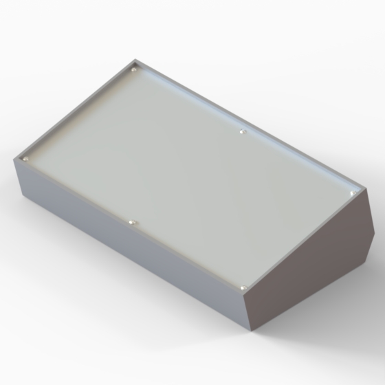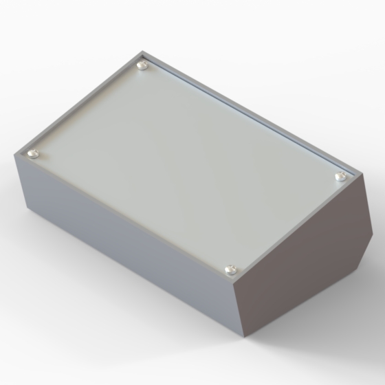 ABS enclosure with a 15° inclined 1mm aluminium panel. The base walls have integral PCB guides and mounting studs. Glossy surface finish. Closing by four screws.