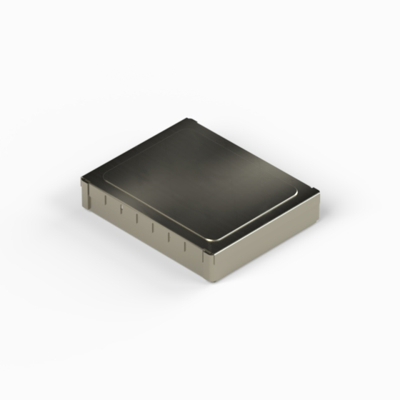 A hot tin-plated steel enclosure with Snap-On, finger-flanged cover and vertical dividers. The dividers have a hole and cutout for wiring. Volume of casing is suitable for easy assembly of professional and High-Technology circuits.